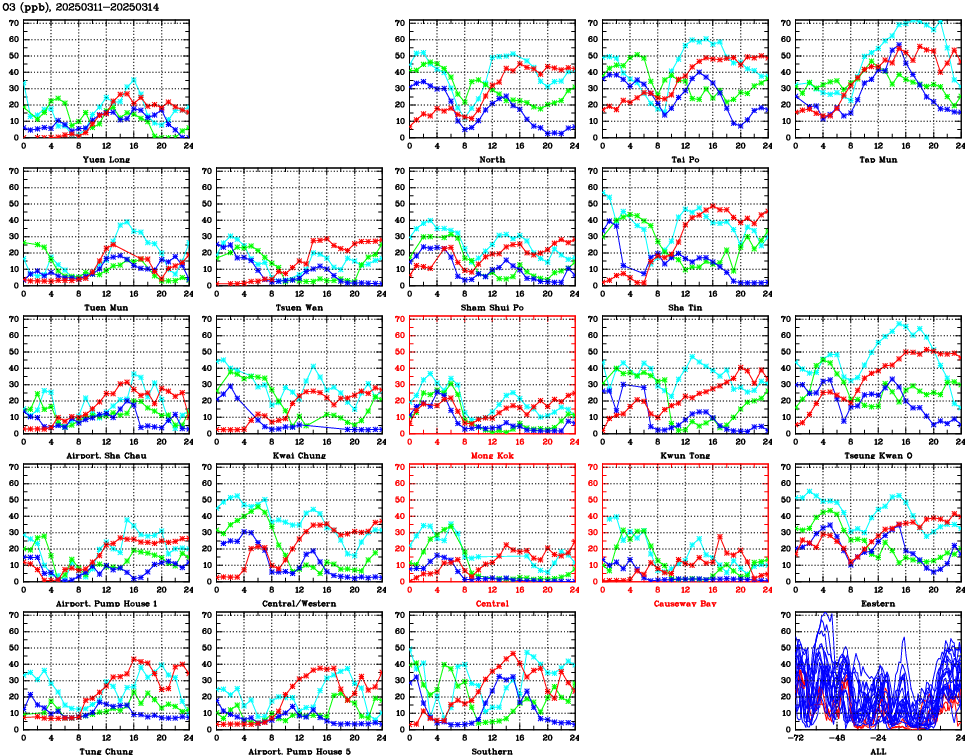 | Air Quality Data Time Series for O3 (2025/03/14) | ( Line colors: Day -3 Day -2 Day -1 Current day ) | 2D Map Current AQHI |