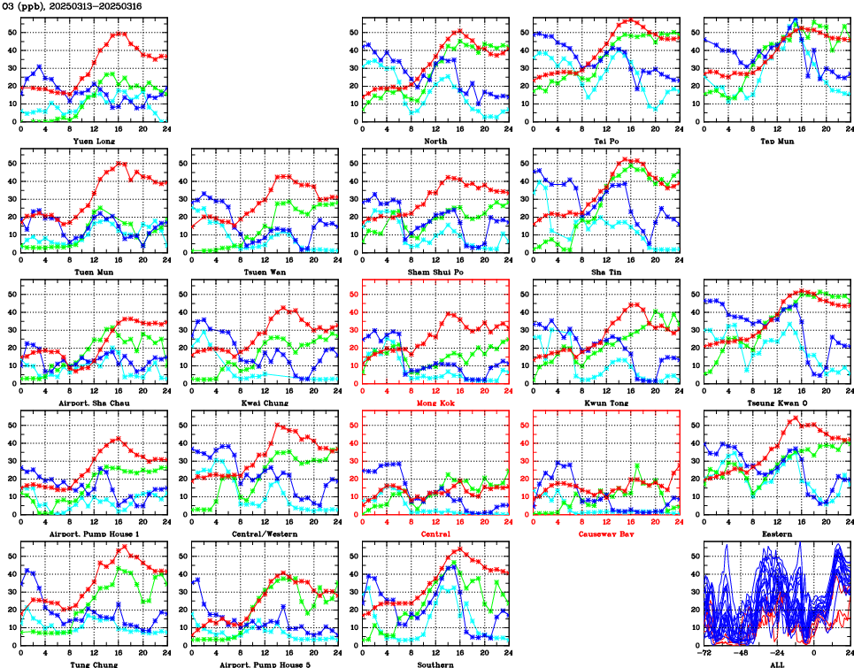 | Air Quality Data Time Series for O3 (2025/03/16) | ( Line colors: Day -3 Day -2 Day -1 Current day ) | 2D Map Current AQHI |