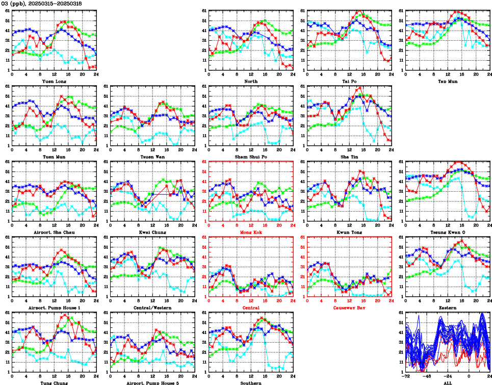 | Air Quality Data Time Series for O3 (2025/03/18) | ( Line colors: Day -3 Day -2 Day -1 Current day ) | 2D Map Current AQHI |