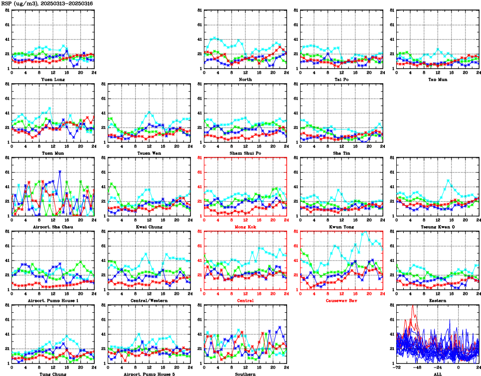 | Air Quality Data Time Series for RSP (2025/03/16) | ( Line colors: Day -3 Day -2 Day -1 Current day ) | 2D Map Current AQHI |