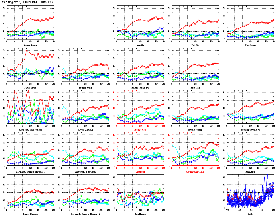 | Air Quality Data Time Series for RSP (2025/03/17) | ( Line colors: Day -3 Day -2 Day -1 Current day ) | 2D Map Current AQHI |