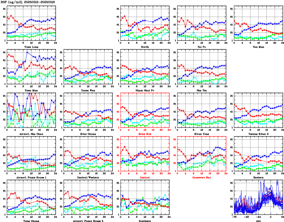| Air Quality Data Time Series for RSP (2025/03/18) | ( Line colors: Day -3 Day -2 Day -1 Current day ) | 2D Map Current AQHI |