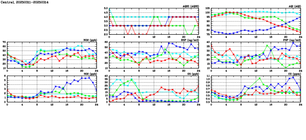 | Air Quality Data Time Series in Central (2025/03/14) | ( Line colors: Day -3 Day -2 Day -1 Current day ) | 2D Map Current AQHI |