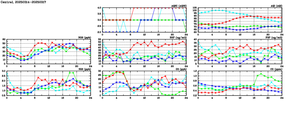 | Air Quality Data Time Series in Central (2025/03/17) | ( Line colors: Day -3 Day -2 Day -1 Current day ) | 2D Map Current AQHI |