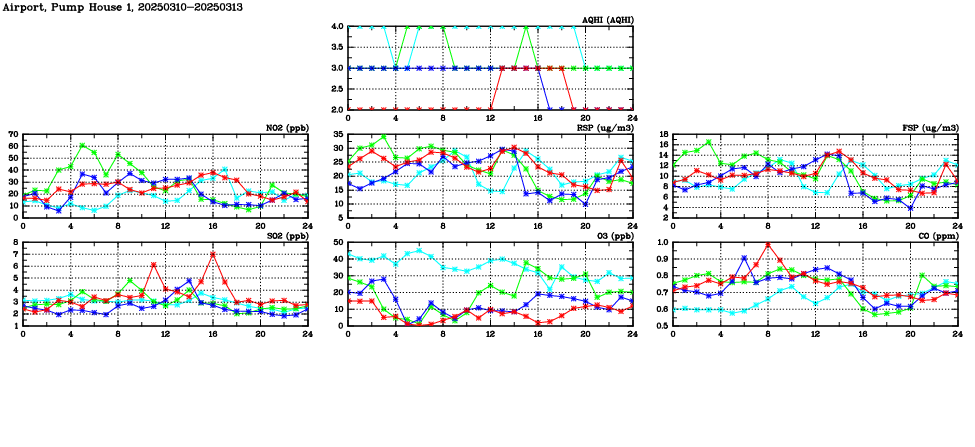 | Air Quality Data Time Series in Airport, Pump House 1 (2025/03/13) | ( Line colors: Day -3 Day -2 Day -1 Current day ) | 2D Map Current AQHI |
