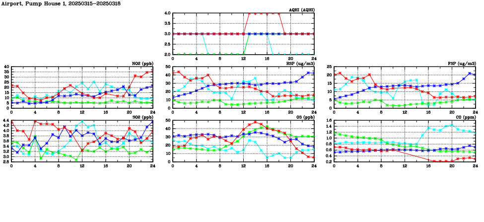 | Air Quality Data Time Series in Airport, Pump House 1 (2025/03/18) | ( Line colors: Day -3 Day -2 Day -1 Current day ) | 2D Map Current AQHI |