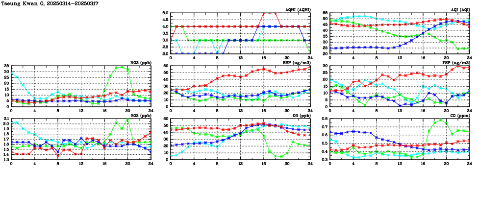 | Air Quality Data Time Series in Tseung Kwan O (2025/03/17) | ( Line colors: Day -3 Day -2 Day -1 Current day ) | 2D Map Current AQHI |