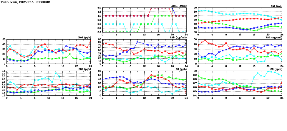 | Air Quality Data Time Series in Tuen Mun (2025/03/18) | ( Line colors: Day -3 Day -2 Day -1 Current day ) | 2D Map Current AQHI |