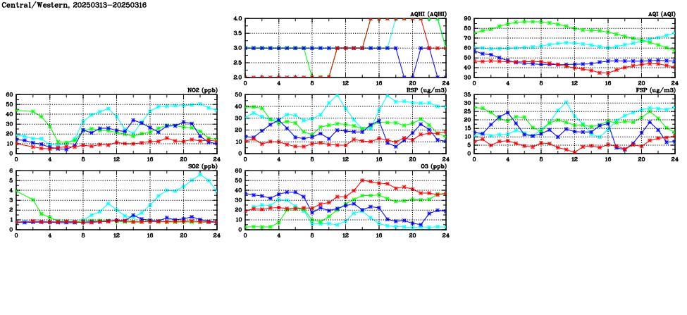 | Air Quality Data Time Series in Central/Western (2025/03/16) | ( Line colors: Day -3 Day -2 Day -1 Current day ) | 2D Map Current AQHI |