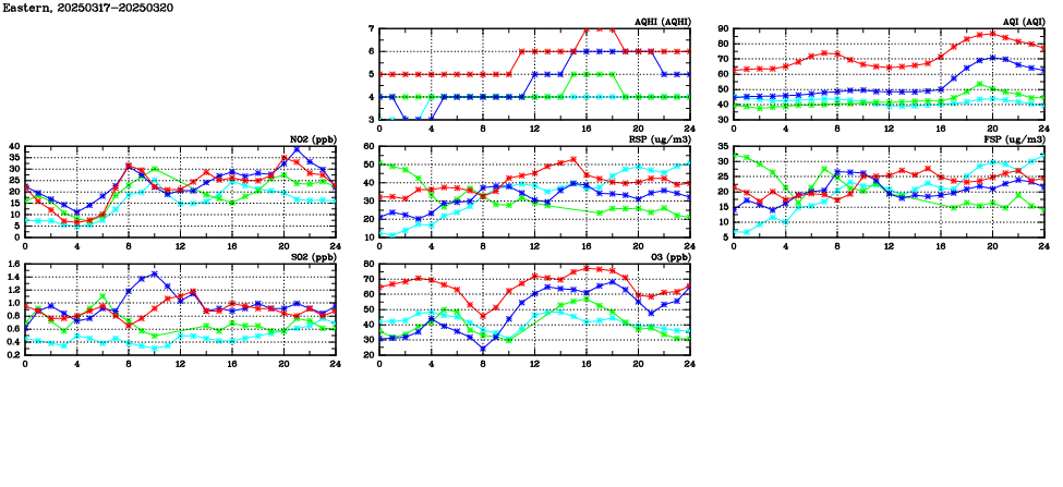| Air Quality Data Time Series in Eastern (2025/03/20) | ( Line colors: Day -3 Day -2 Day -1 Current day ) | 2D Map Current AQHI |