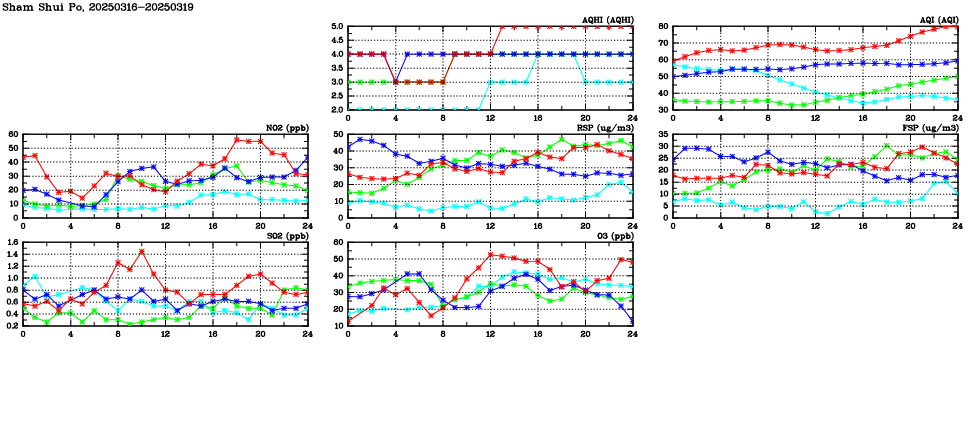 | Air Quality Data Time Series in Sham Shui Po (2025/03/19) | ( Line colors: Day -3 Day -2 Day -1 Current day ) | 2D Map Current AQHI |