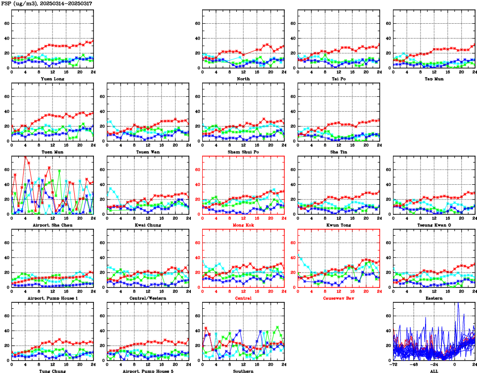 | Air Quality Data Time Series for FSP (2025/03/17) | ( Line colors: Day -3 Day -2 Day -1 Current day ) | 2D Map Current AQHI |