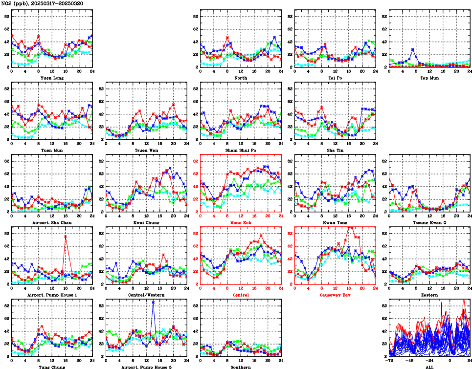 | Air Quality Data Time Series for NO2 (2025/03/20) | ( Line colors: Day -3 Day -2 Day -1 Current day ) | 2D Map Current AQHI |