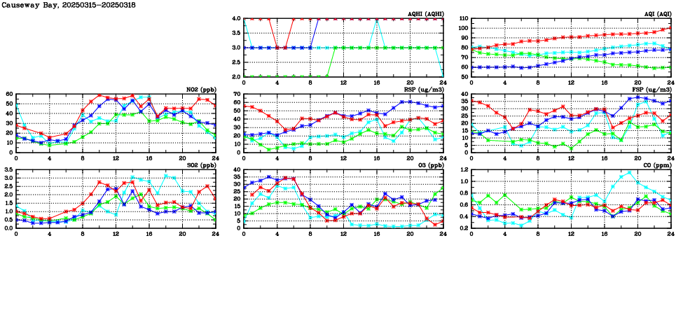 | Air Quality Data Time Series in Causeway Bay (2025/03/18) | ( Line colors: Day -3 Day -2 Day -1 Current day ) | 2D Map Current AQHI |