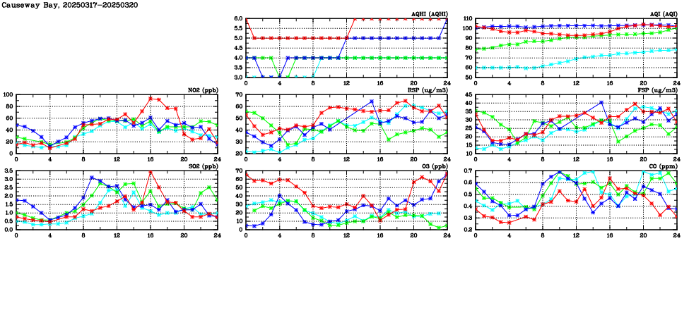 | Air Quality Data Time Series in Causeway Bay (2025/03/20) | ( Line colors: Day -3 Day -2 Day -1 Current day ) | 2D Map Current AQHI |