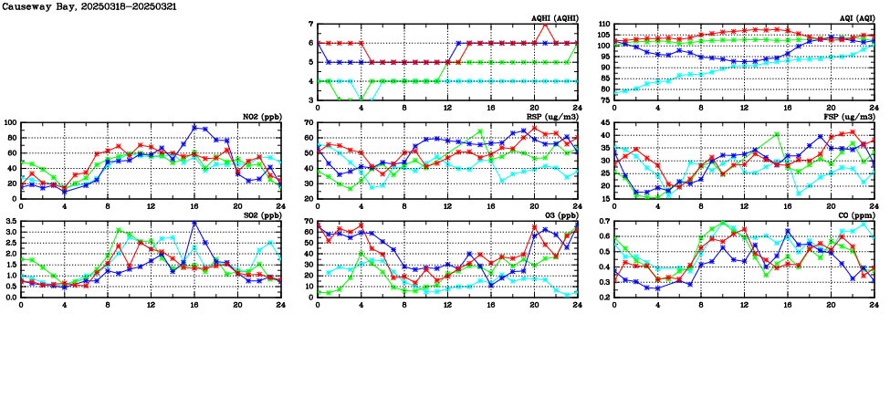 | Air Quality Data Time Series in Causeway Bay (2025/03/21) | ( Line colors: Day -3 Day -2 Day -1 Current day ) | 2D Map Current AQHI |