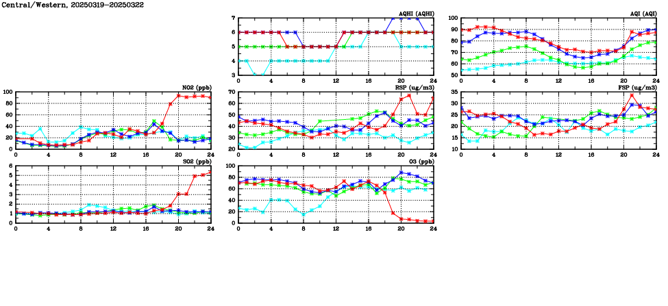 | Air Quality Data Time Series in Central/Western (2025/03/22) | ( Line colors: Day -3 Day -2 Day -1 Current day ) | 2D Map Current AQHI |