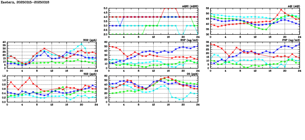 | Air Quality Data Time Series in Eastern (2025/03/18) | ( Line colors: Day -3 Day -2 Day -1 Current day ) | 2D Map Current AQHI |