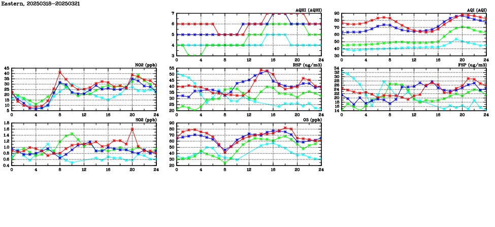 | Air Quality Data Time Series in Eastern (2025/03/21) | ( Line colors: Day -3 Day -2 Day -1 Current day ) | 2D Map Current AQHI |