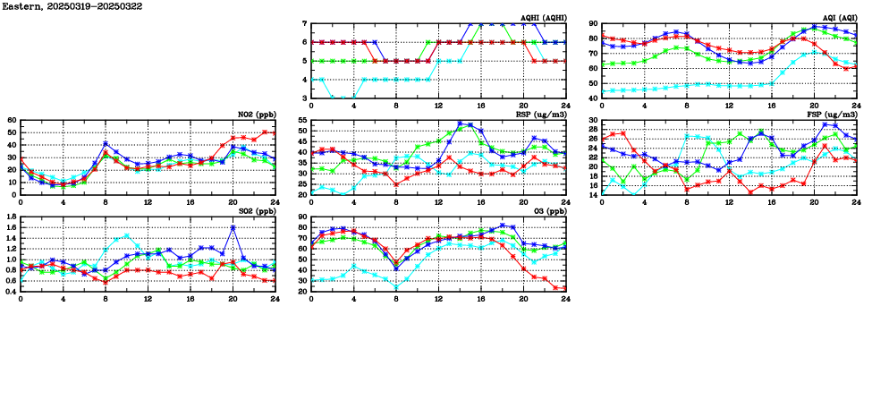 | Air Quality Data Time Series in Eastern (2025/03/22) | ( Line colors: Day -3 Day -2 Day -1 Current day ) | 2D Map Current AQHI |