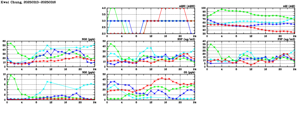 | Air Quality Data Time Series in Kwai Chung (2025/03/16) | ( Line colors: Day -3 Day -2 Day -1 Current day ) | 2D Map Current AQHI |