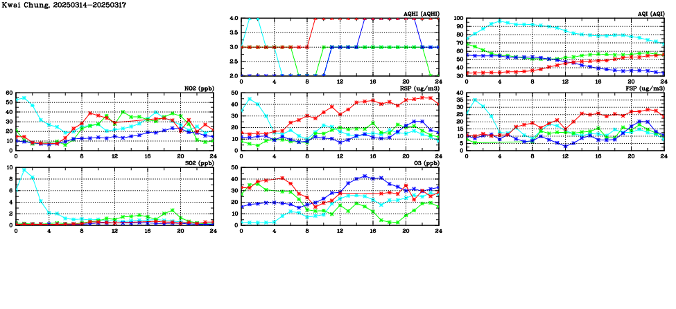 | Air Quality Data Time Series in Kwai Chung (2025/03/17) | ( Line colors: Day -3 Day -2 Day -1 Current day ) | 2D Map Current AQHI |