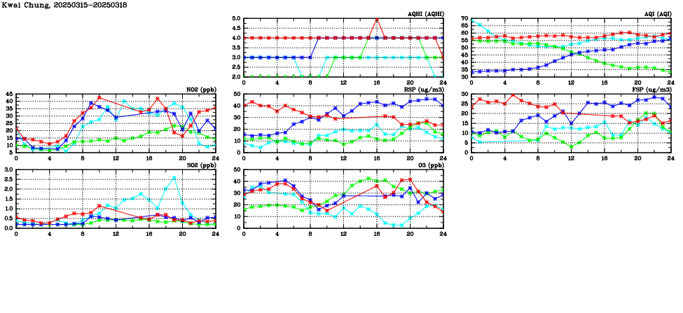| Air Quality Data Time Series in Kwai Chung (2025/03/18) | ( Line colors: Day -3 Day -2 Day -1 Current day ) | 2D Map Current AQHI |