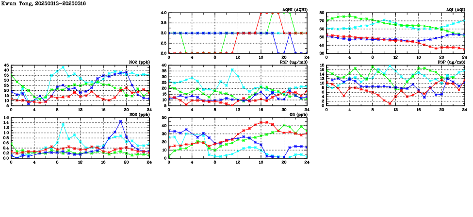 | Air Quality Data Time Series in Kwun Tong (2025/03/16) | ( Line colors: Day -3 Day -2 Day -1 Current day ) | 2D Map Current AQHI |