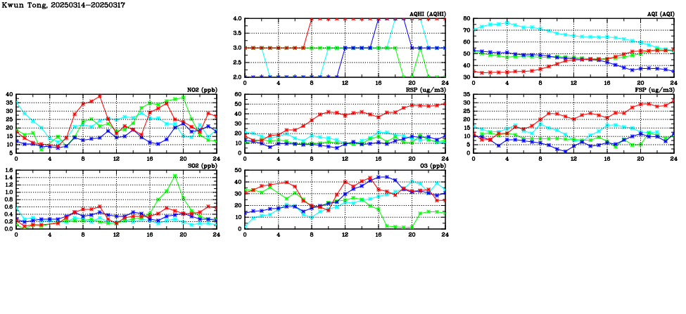 | Air Quality Data Time Series in Kwun Tong (2025/03/17) | ( Line colors: Day -3 Day -2 Day -1 Current day ) | 2D Map Current AQHI |