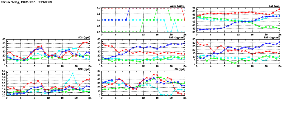 | Air Quality Data Time Series in Kwun Tong (2025/03/18) | ( Line colors: Day -3 Day -2 Day -1 Current day ) | 2D Map Current AQHI |