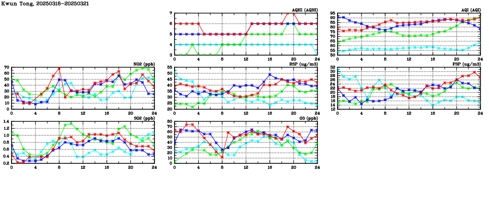 | Air Quality Data Time Series in Kwun Tong (2025/03/21) | ( Line colors: Day -3 Day -2 Day -1 Current day ) | 2D Map Current AQHI |