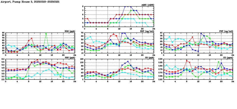 | Air Quality Data Time Series in Airport, Pump House 5 (2025/03/21) | ( Line colors: Day -3 Day -2 Day -1 Current day ) | 2D Map Current AQHI |