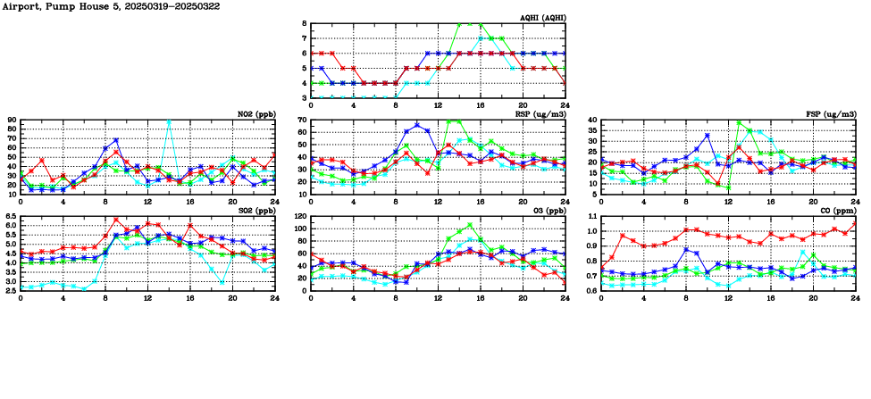 | Air Quality Data Time Series in Airport, Pump House 5 (2025/03/22) | ( Line colors: Day -3 Day -2 Day -1 Current day ) | 2D Map Current AQHI |