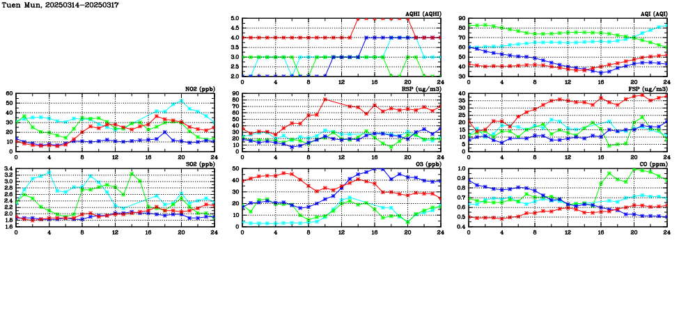 | Air Quality Data Time Series in Tuen Mun (2025/03/17) | ( Line colors: Day -3 Day -2 Day -1 Current day ) | 2D Map Current AQHI |