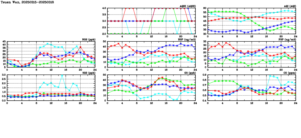 | Air Quality Data Time Series in Tsuen Wan (2025/03/18) | ( Line colors: Day -3 Day -2 Day -1 Current day ) | 2D Map Current AQHI |