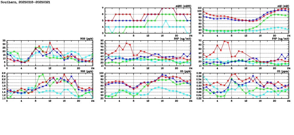 | Air Quality Data Time Series in Southern (2025/03/21) | ( Line colors: Day -3 Day -2 Day -1 Current day ) | 2D Map Current AQHI |
