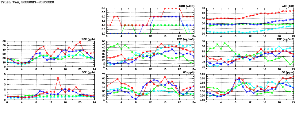 | Air Quality Data Time Series in Tsuen Wan (2025/03/20) | ( Line colors: Day -3 Day -2 Day -1 Current day ) | 2D Map Current AQHI |