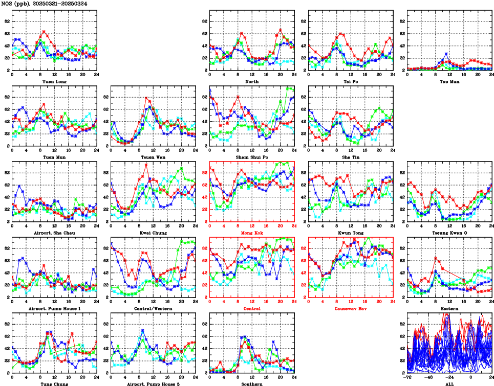 | Air Quality Data Time Series for NO2 (2025/03/24) | ( Line colors: Day -3 Day -2 Day -1 Current day ) | 2D Map Current AQHI |