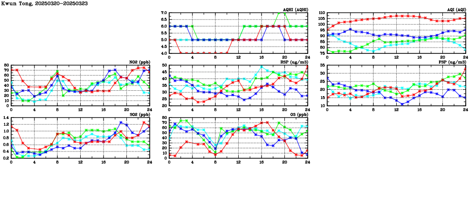 | Air Quality Data Time Series in Kwun Tong (2025/03/23) | ( Line colors: Day -3 Day -2 Day -1 Current day ) | 2D Map Current AQHI |