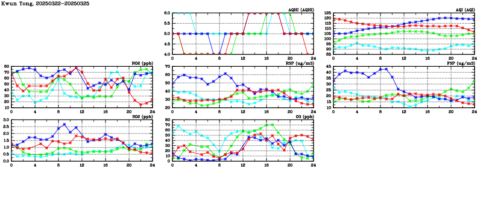 | Air Quality Data Time Series in Kwun Tong (2025/03/25) | ( Line colors: Day -3 Day -2 Day -1 Current day ) | 2D Map Current AQHI |