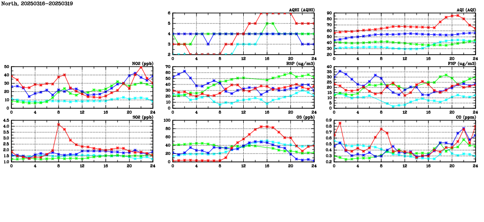 | Air Quality Data Time Series in North (2025/03/19) | ( Line colors: Day -3 Day -2 Day -1 Current day ) | 2D Map Current AQHI |