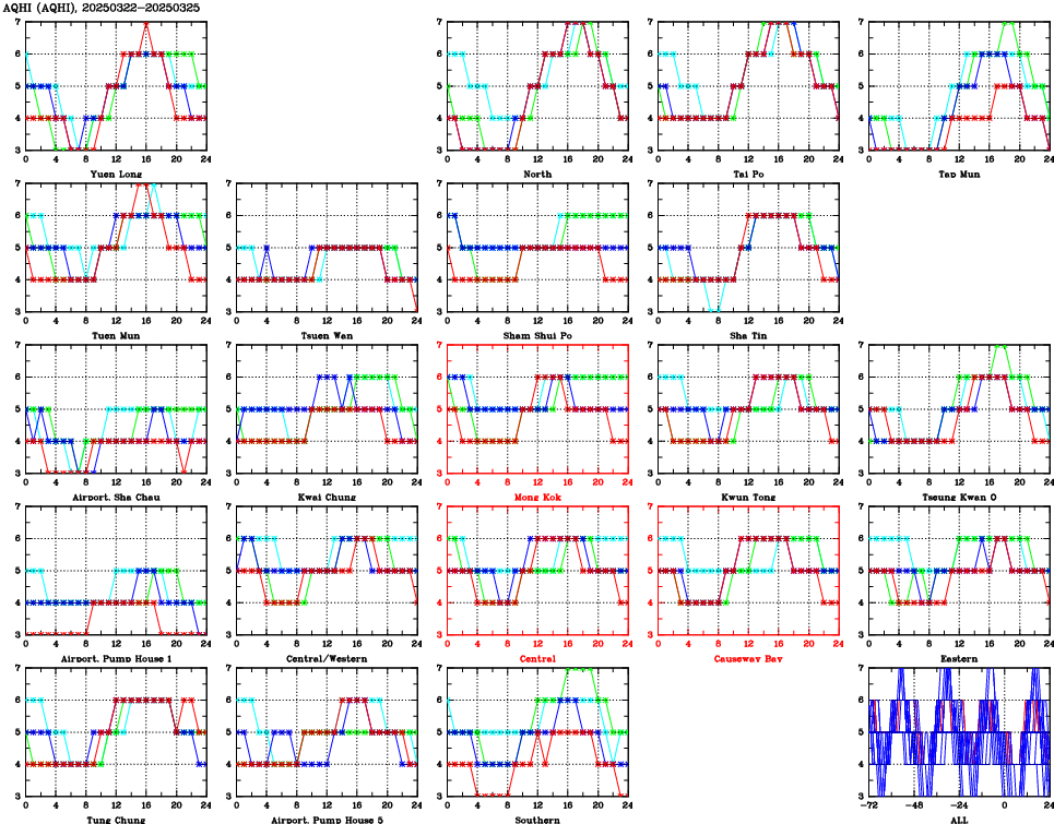 | Air Quality Data Time Series for AQHI (2025/03/25) | ( Line colors: Day -3 Day -2 Day -1 Current day ) | 2D Map Current AQHI |