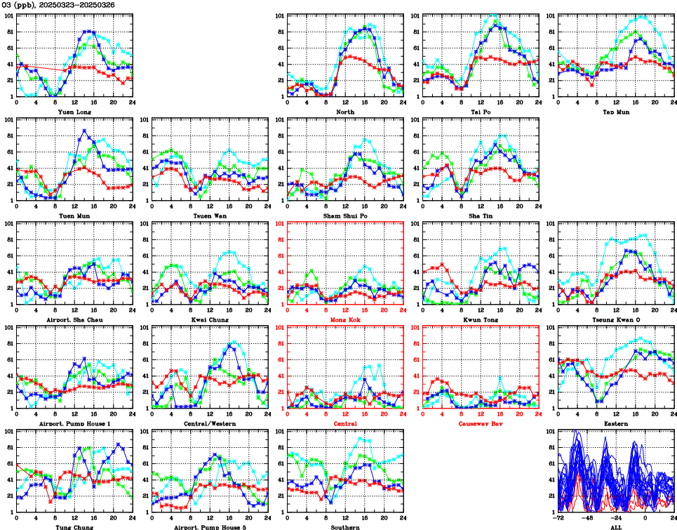 | Air Quality Data Time Series for O3 (2025/03/26) | ( Line colors: Day -3 Day -2 Day -1 Current day ) | 2D Map Current AQHI |