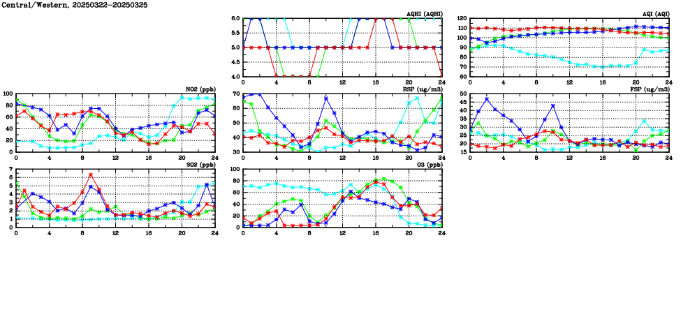 | Air Quality Data Time Series in Central/Western (2025/03/25) | ( Line colors: Day -3 Day -2 Day -1 Current day ) | 2D Map Current AQHI |