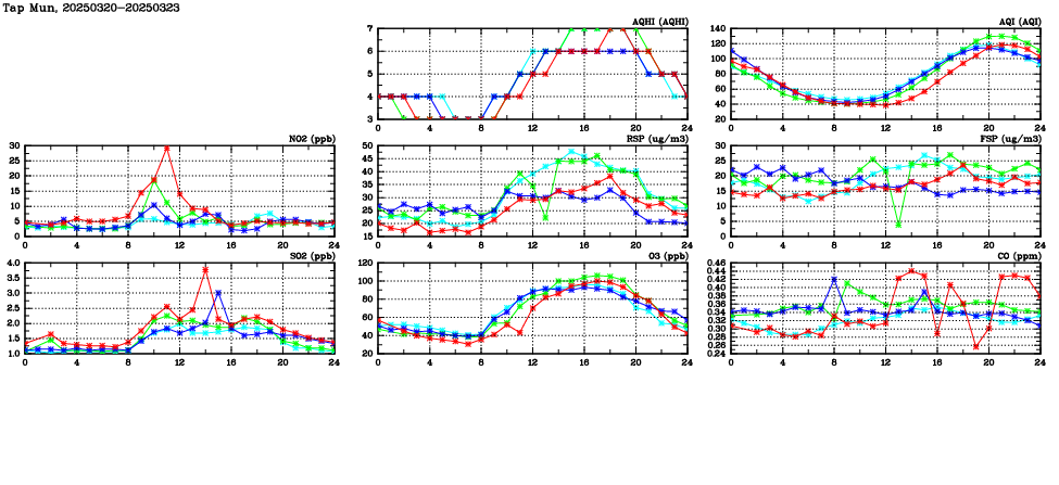 | Air Quality Data Time Series in Tap Mun (2025/03/23) | ( Line colors: Day -3 Day -2 Day -1 Current day ) | 2D Map Current AQHI |