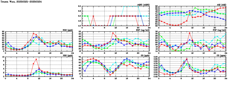 | Air Quality Data Time Series in Tsuen Wan (2025/03/24) | ( Line colors: Day -3 Day -2 Day -1 Current day ) | 2D Map Current AQHI |