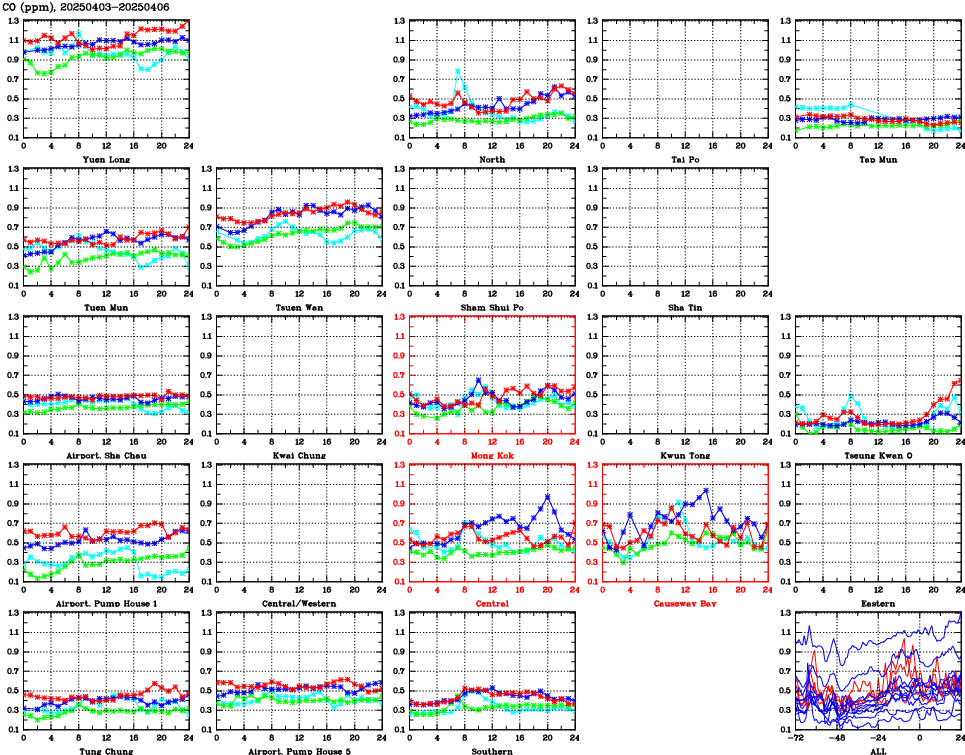 | Air Quality Data Time Series for CO (2025/04/06) | ( Line colors: Day -3 Day -2 Day -1 Current day ) | 2D Map Current AQHI |