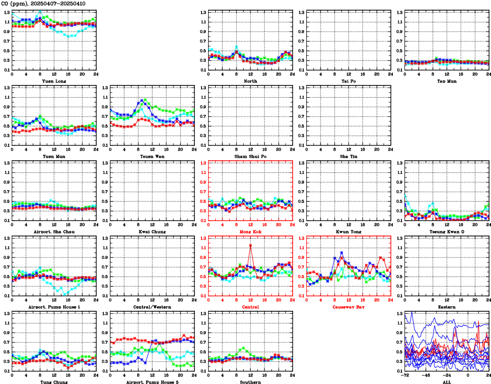 | Air Quality Data Time Series for CO (2025/04/10) | ( Line colors: Day -3 Day -2 Day -1 Current day ) | 2D Map Current AQHI |