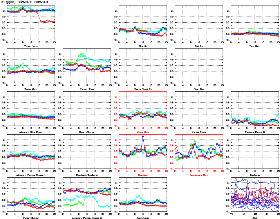 | Air Quality Data Time Series for CO (2025/04/11) | ( Line colors: Day -3 Day -2 Day -1 Current day ) | 2D Map Current AQHI |