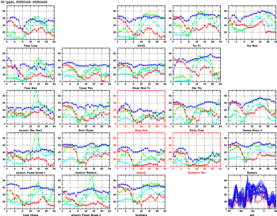 | Air Quality Data Time Series for O3 (2025/04/05) | ( Line colors: Day -3 Day -2 Day -1 Current day ) | 2D Map Current AQHI |